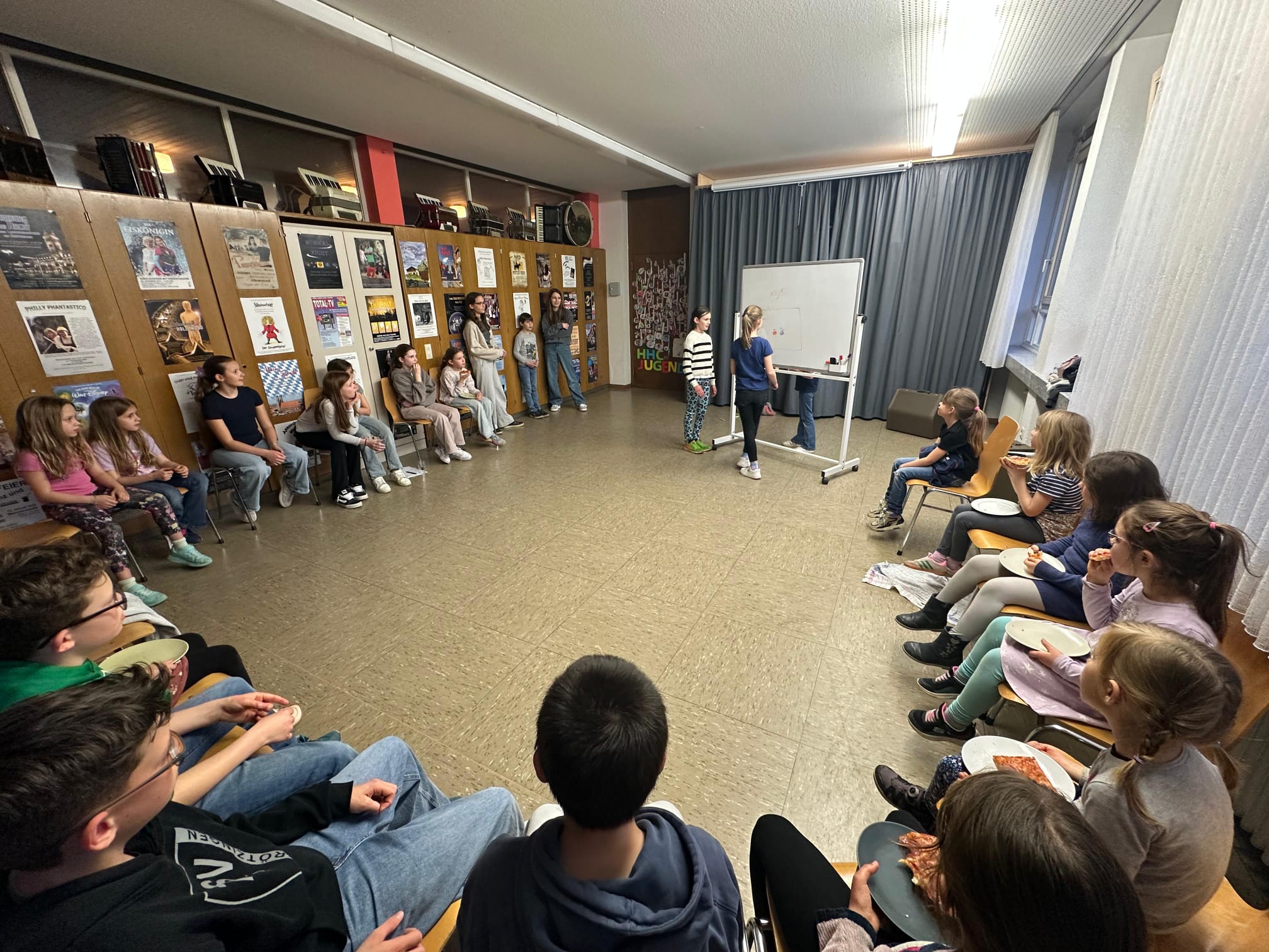 Während die ersten beiden Gruppen fleißig Pizza 🍕 und einen Nachtisch 🍮 zubereitet haben, waren die anderen beiden Gruppen damit beschäftigt, kleine Theaterstücke einzuüben 🎭. Während die Köche ihre Pizza genossen, hieß es für die anderen: Showtime! ✨